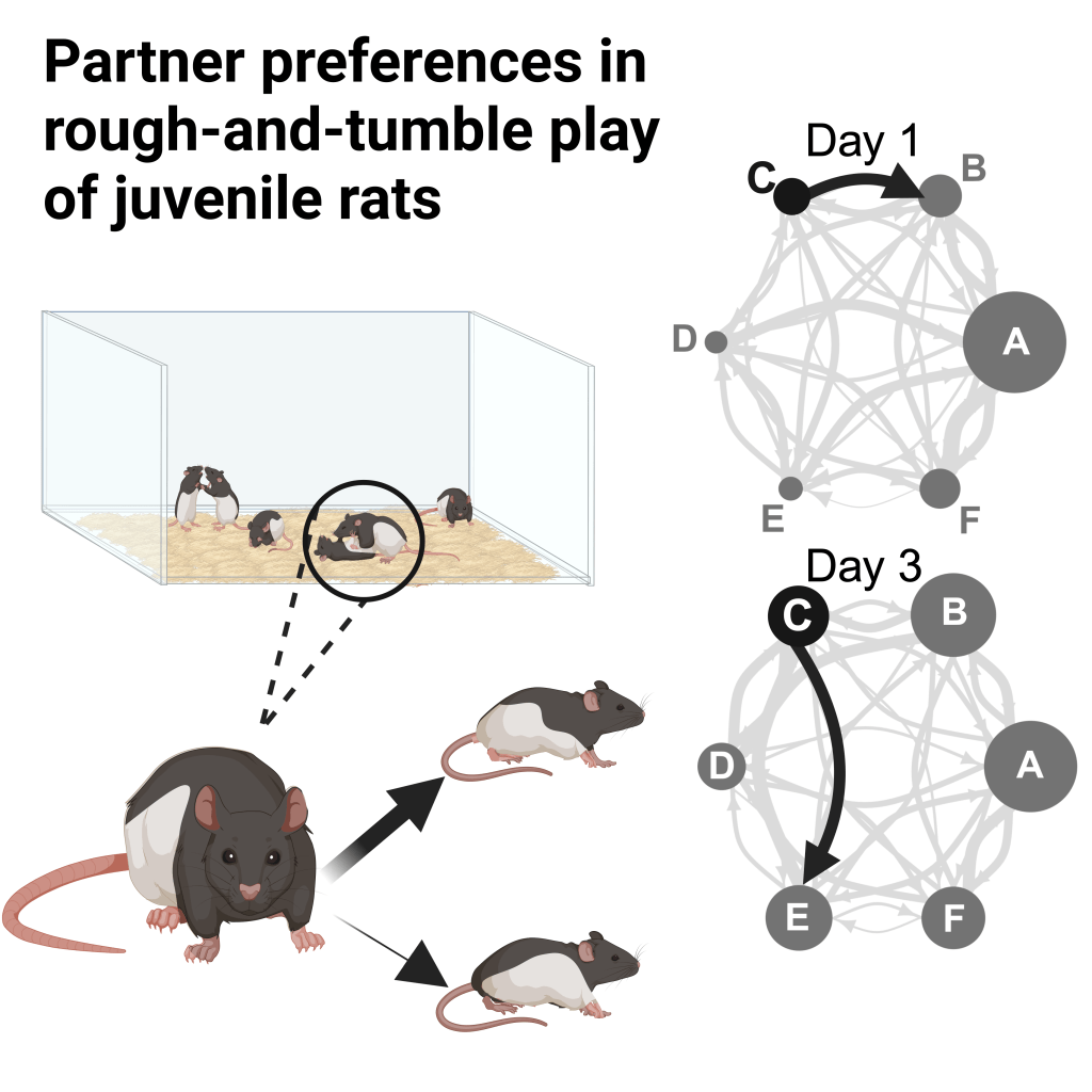 This line of research explores how young animals choose their social partners and how familiarity, novelty, and group context shape the dynamics of play. Across several studies, I’ve shown that juvenile male rats balance between familiar and unfamiliar partners — preferring a “just right” level of novelty that promotes engagement and learning. These partner preferences shift depending on group size and social composition, emerging in group settings but not in isolated pairs, and often becoming unstable even among familiar cage mates. Together, this work demonstrates that social play is a context-dependent and dynamic process, offering insights into how animals regulate social motivation, recognize individuals, and build the cognitive skills that underlie complex social behavior.
