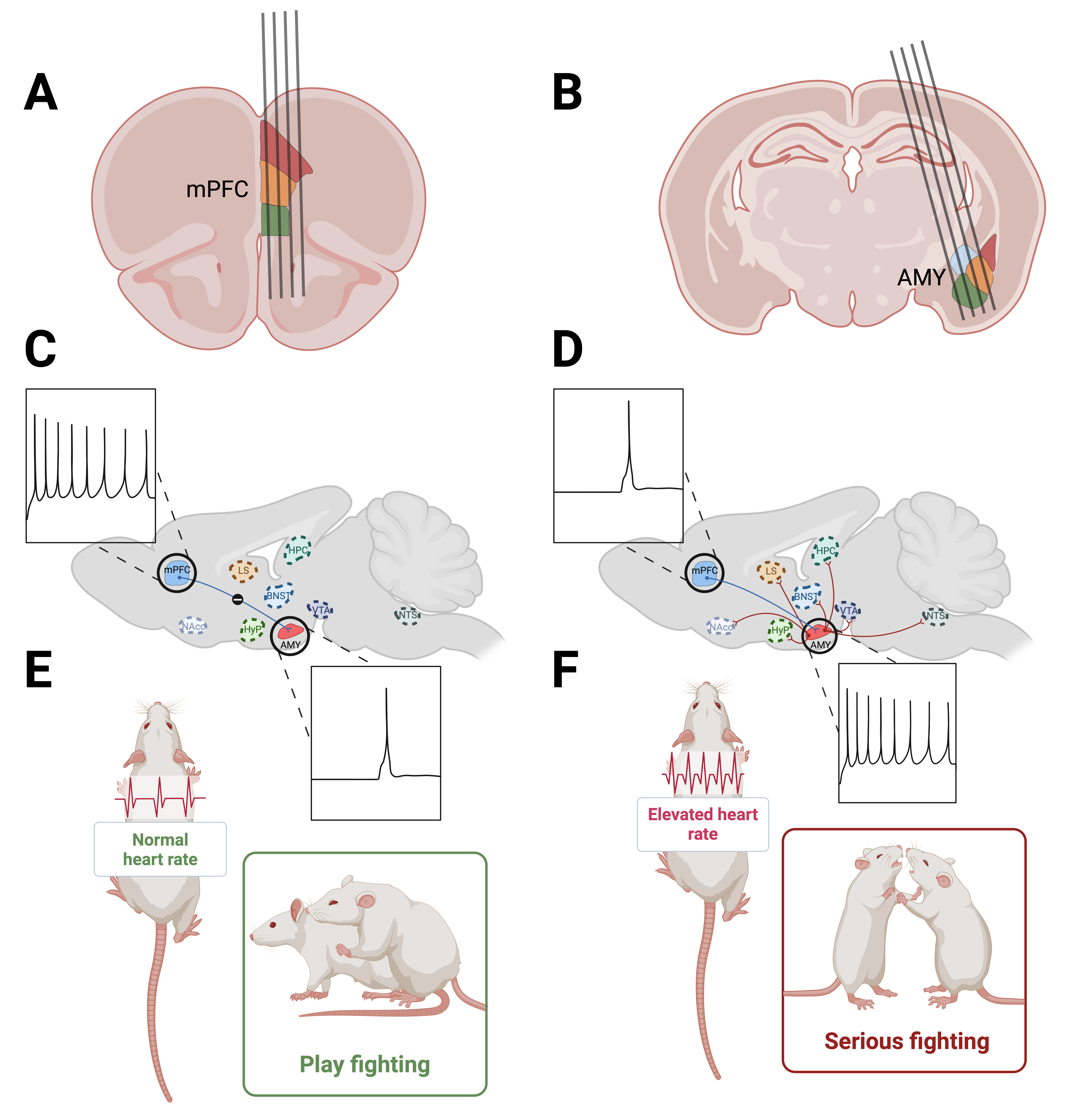 How does the brain keep emotions in check during social encounters — and what happens when that system goes awry? Our research investigates how neural circuits between the medial prefrontal cortex and the amygdala enable animals to balance playfulness, aggression, and emotional control. Using Neuropixels 2.0 electrophysiology and wireless telemetry in freely behaving rats, we record real-time brain and physiological activity as animals engage in both social interactions and non-social challenges. By comparing animals that experience typical juvenile play with those deprived of it, we aim to uncover how early-life experiences shape the brain’s ability to regulate emotion across contexts. This work bridges behavioral neuroscience, physiology, and advanced neurotechnology to reveal how play builds resilient brains — and to provide insights into disorders like anxiety, ADHD, and autism, where emotional regulation is disrupted.