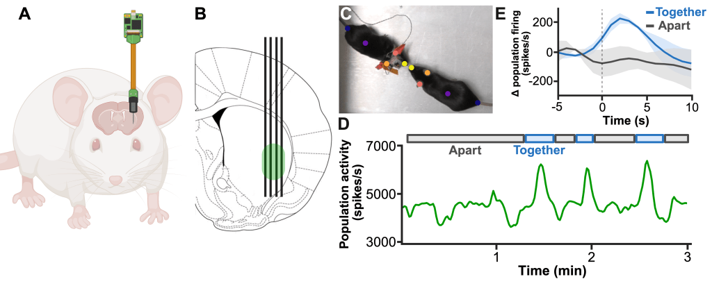 Neural population activity during social interaction. (A) Cartoon illustrating Neuropixels probe implantation in freely behaving mice. (B) Recording location within the striatum. Green highlights the area of the probe that was recording neural activity. (C) Two mice are tracked using markerless pose estimation (DeepLabCut). (D) Population neural activity recorded across a behavioural session, aligned with periods when animals are interacting (“together”) or separated (“apart”). (E) Average change in firing rates aligned to the onset of social interaction, showing increased neural population activity when mice engage socially.
